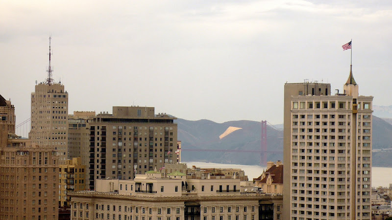 It’s a nice day though. A nice break from the rain lately. I took a picture this morning from the apartment, of that giant undie displayed on the top of the mountain. I have a good idea what that is, it has nothing to do with Halloween. Speaking of giant, the City has been suffering Giant fever lately due to its recent victory. You see orange and black color everywhere. It’s quite silly to me. It seems everybody likes a winner. When Giant was losing over the years, I never see this type of enthusiasm. Suddenly, the players become "heroes." Why? When I walked by the Bank of America Building the other morning, I saw a giant Giant flag were flying. It was indeed giant! I was impressed and had to take a photo of it.